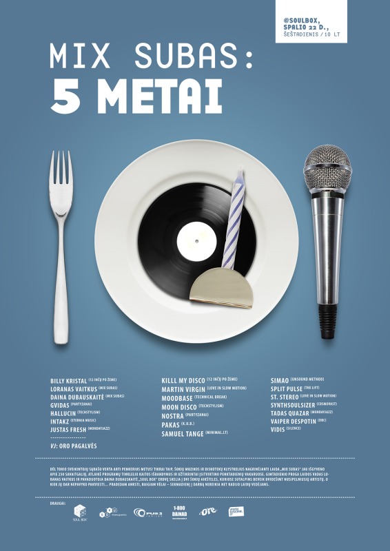 Spalio 22-ąją vis dar naujame Vilniaus klube Soul Box visi, kada nors kalbėję ar groję Mix Subo eteryje, gal net netilptų. Visgi Loranas Vaitkus ir jau geras pusmetis jam kompaniją eteryje palaikanti žurnalistė Daina Dubauskaitė į septynias gimtadienio vakarėlio valandas šiaip ne taip surikiavo 20 artimų radijo laidos draugų. Tai – Partyzanų, Techstylism, Mondayjazz, Love In Slow Motion, Eternia, 12 inčų po žeme, Silence ir krūvos kitų susivienijimų įkūrėjai ir nariai, pasiruošę penkmečio proga Mix Subui iškepti riebų elektronikos tortą. Kalorijų skaičiuoti tikrai nebus kada, mat šokiai vyks iškart dviejose Soul Box erdvėse. Vaizdine šventės dalimi rūpinsis Oro pagalvės.